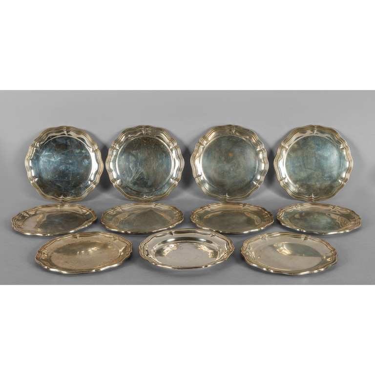 Undici piatti in argento sbalzato in stile barocco