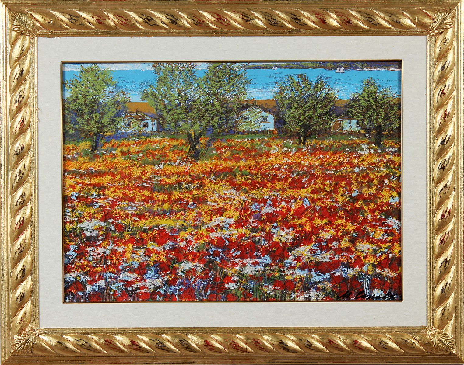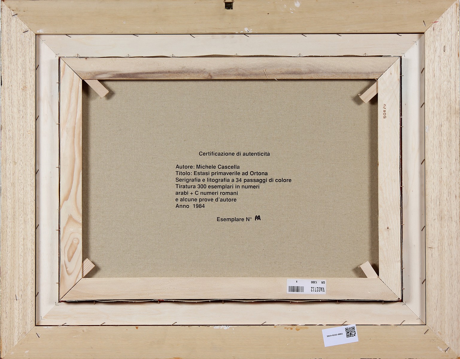 CASCELLA MICHELE (1892 - 1989) Estasi primaverile ad Ortone. Serigrafia su tela. Cm 70,00 x 50,00. P.A. Tiratura: 300 + C + P.A. Tiratura e firma in basso a pennarello. Al retro timbro con dati dell'opera. Cornice presente