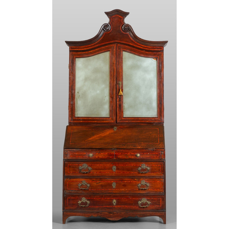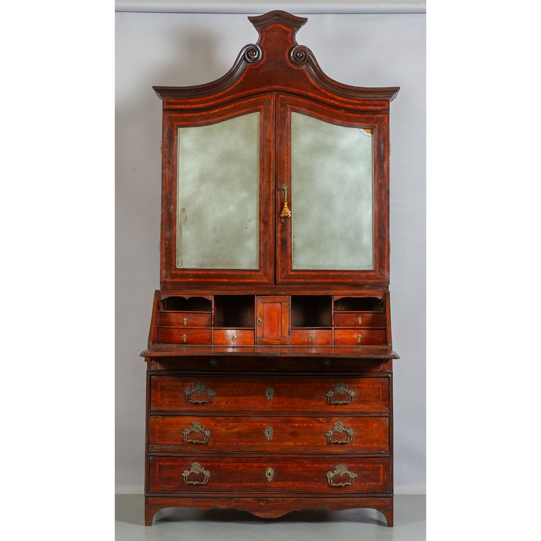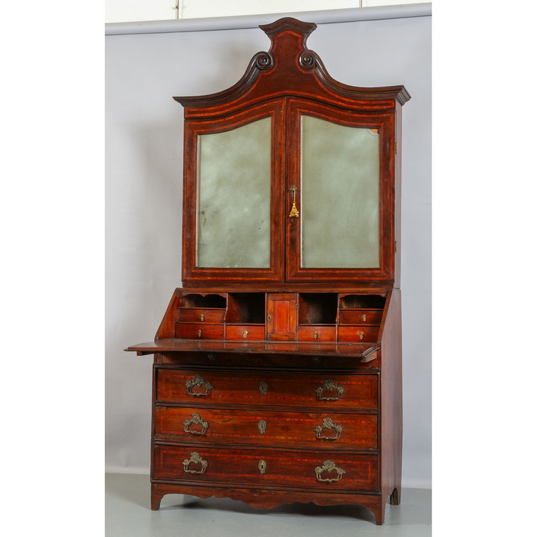 Mobile a doppio corpo in massello filettato in bois de rose parte inferiore a doppia mossa sul fronte con tre cassetti grandi e due piccoli parte superiore a due sportelli con specchi cappello a carabiniere Genova sec.XVIII
