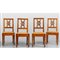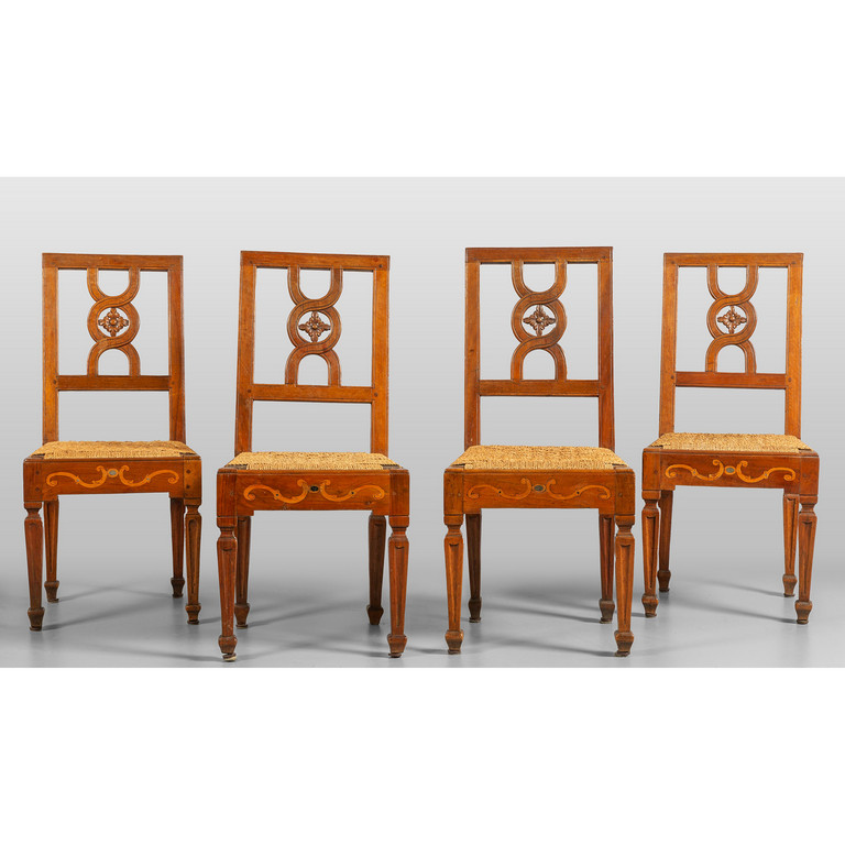 Quattro sedie Luigi XVI in noce schienale traforato fascia con intarsio e sedile in paglia intrecciata Piemonte fine sec.XVIII