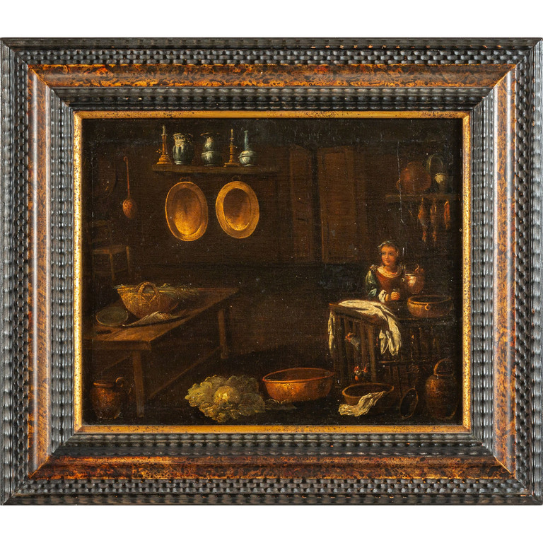 Scuola emiliana sec.XVIII 'Interno di cucina con figure' olio