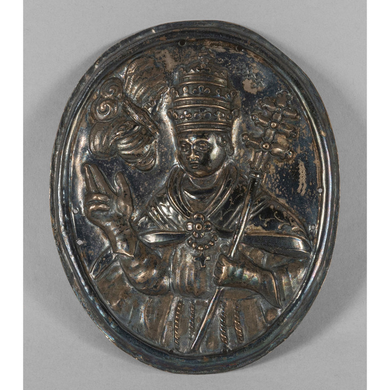 Placca da confraternita in argento di forma ovale raffigurante un Vescovo probabilmente Napoli sec.XVIII