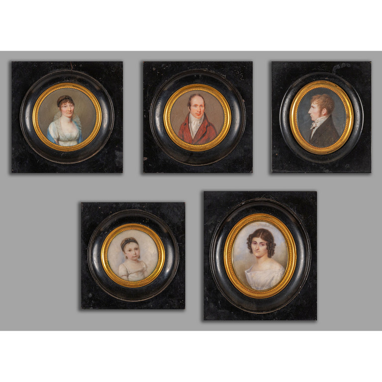 Cinque miniature su avorio raffiguranti personaggi femminili e maschili di diverse misure sec.XIX