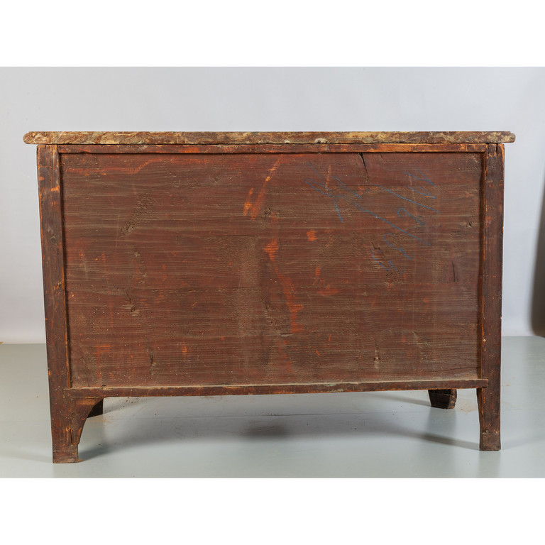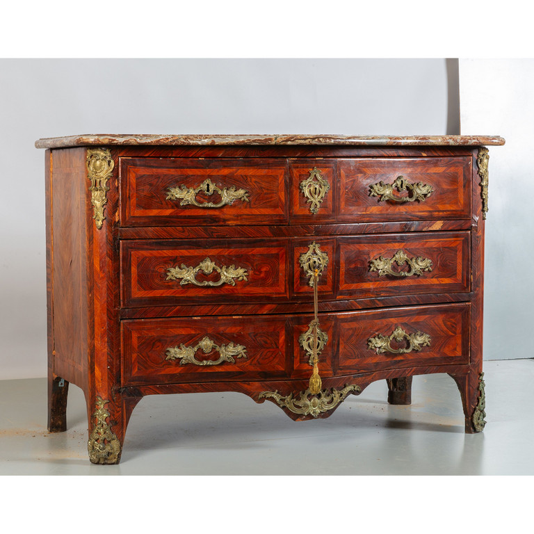 Comò Luigi XIV a due cassetti grandi e due piccoli mosso sul fronte lastronato in violetto e filettato in legno di rosa piano in marmo Francia sec.XVIII (difetti)