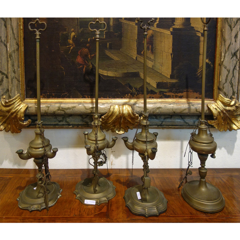 Quattro lucerne fiorentine in bronzo ed un vasetto adattato a lampada