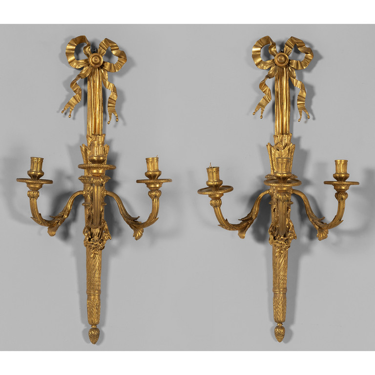 Coppia di grandi apliques a tre luci in bronzo dorato Francia inizi sec.XX