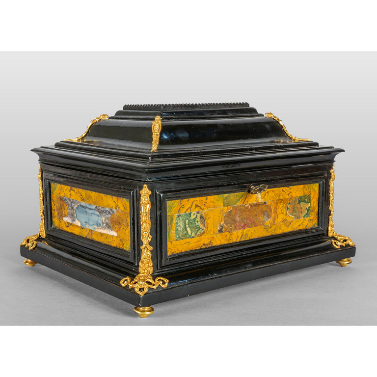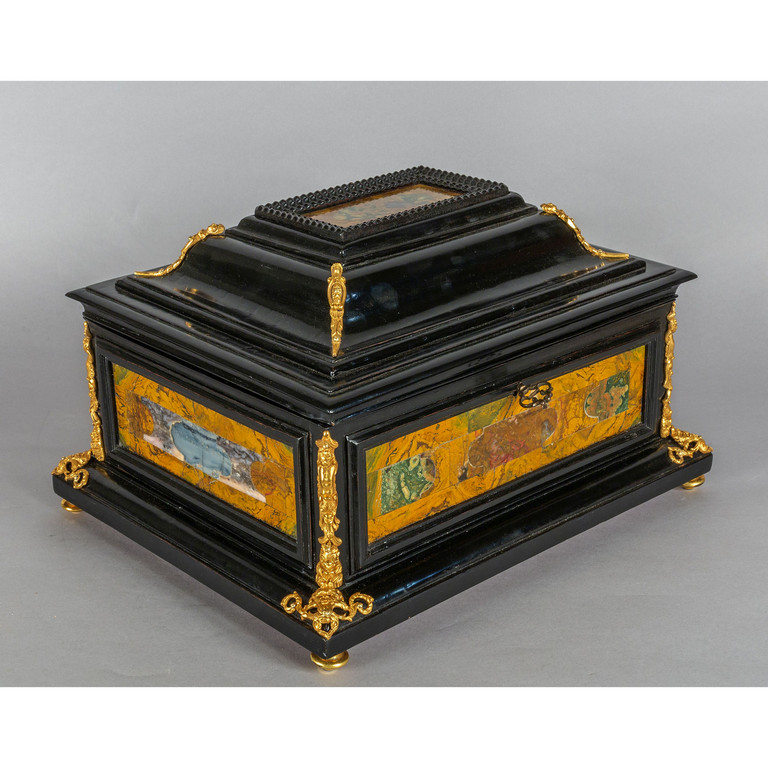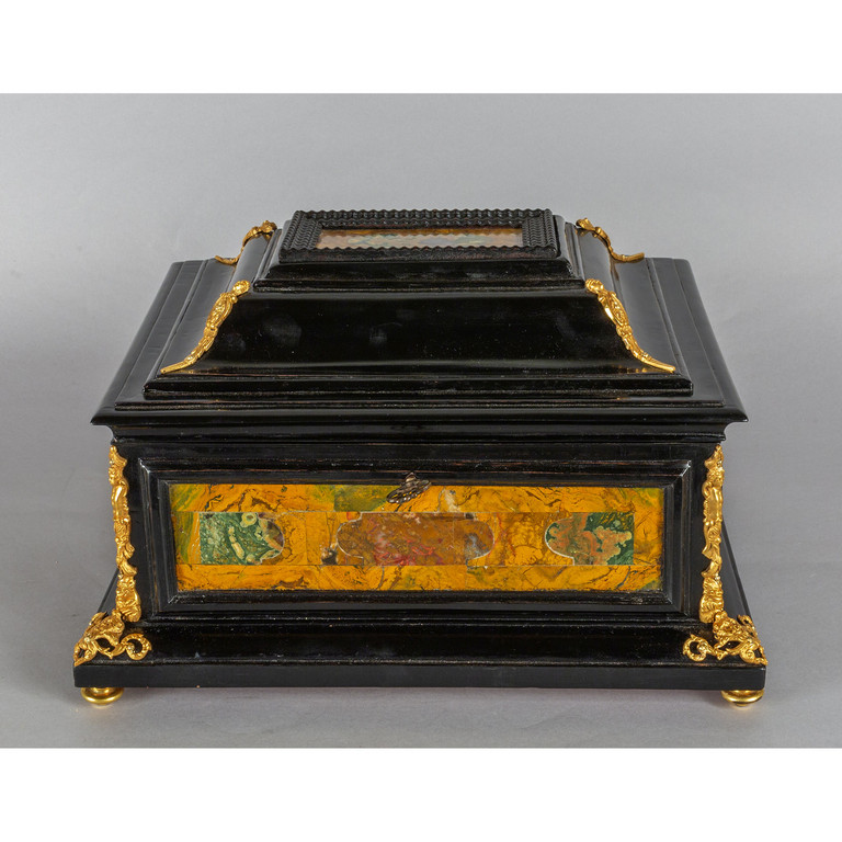 Scatola in legno ebanizzato con intarsi in pietre dure e ricca decorazione in bronzo dorato inizi sec.XIX