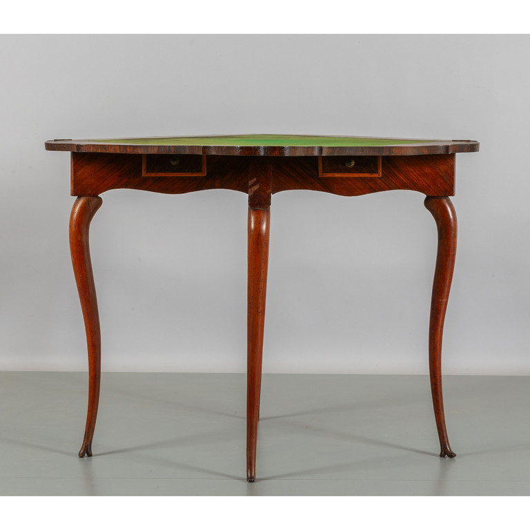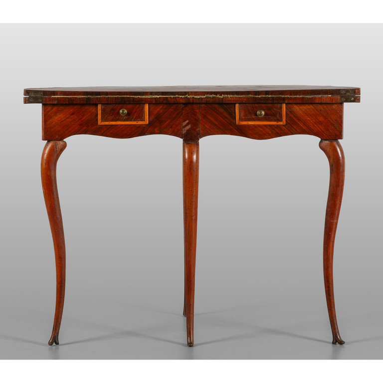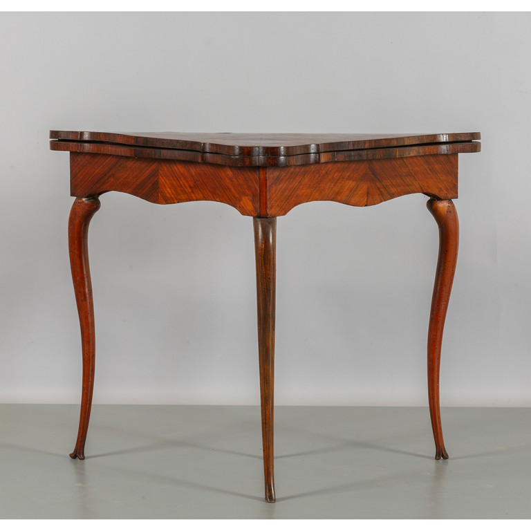 Tavolo da gioco Luigi XV a fazzoletto lastronato in noce d'India e filettato in bois de rose gambe in massello Genova sec.XVIII