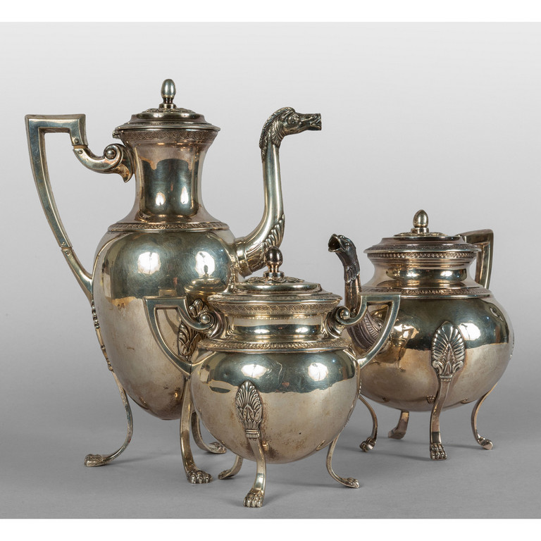 Caffettiera theiera e zuccheriera in argento in stile neoclassico