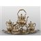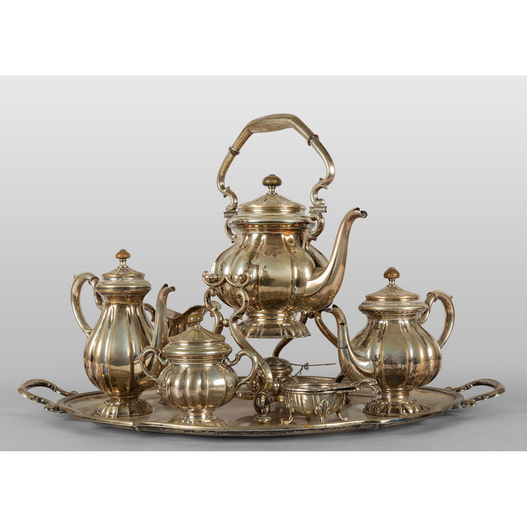 Servizio da thè (cinque pezzi con vassoio e due colini) in argento sbalzato in stile barocco
