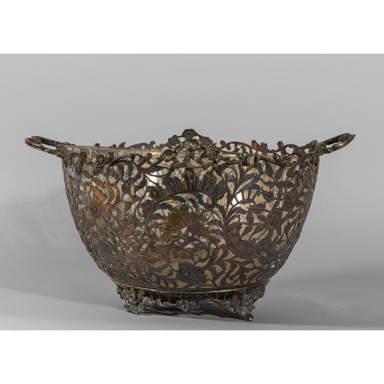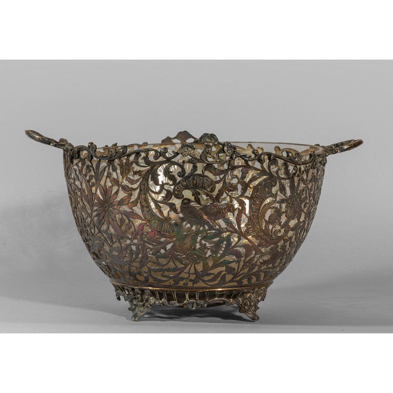 Coppa in argento traforato con manici e controcoppa in vetro sec.XIX