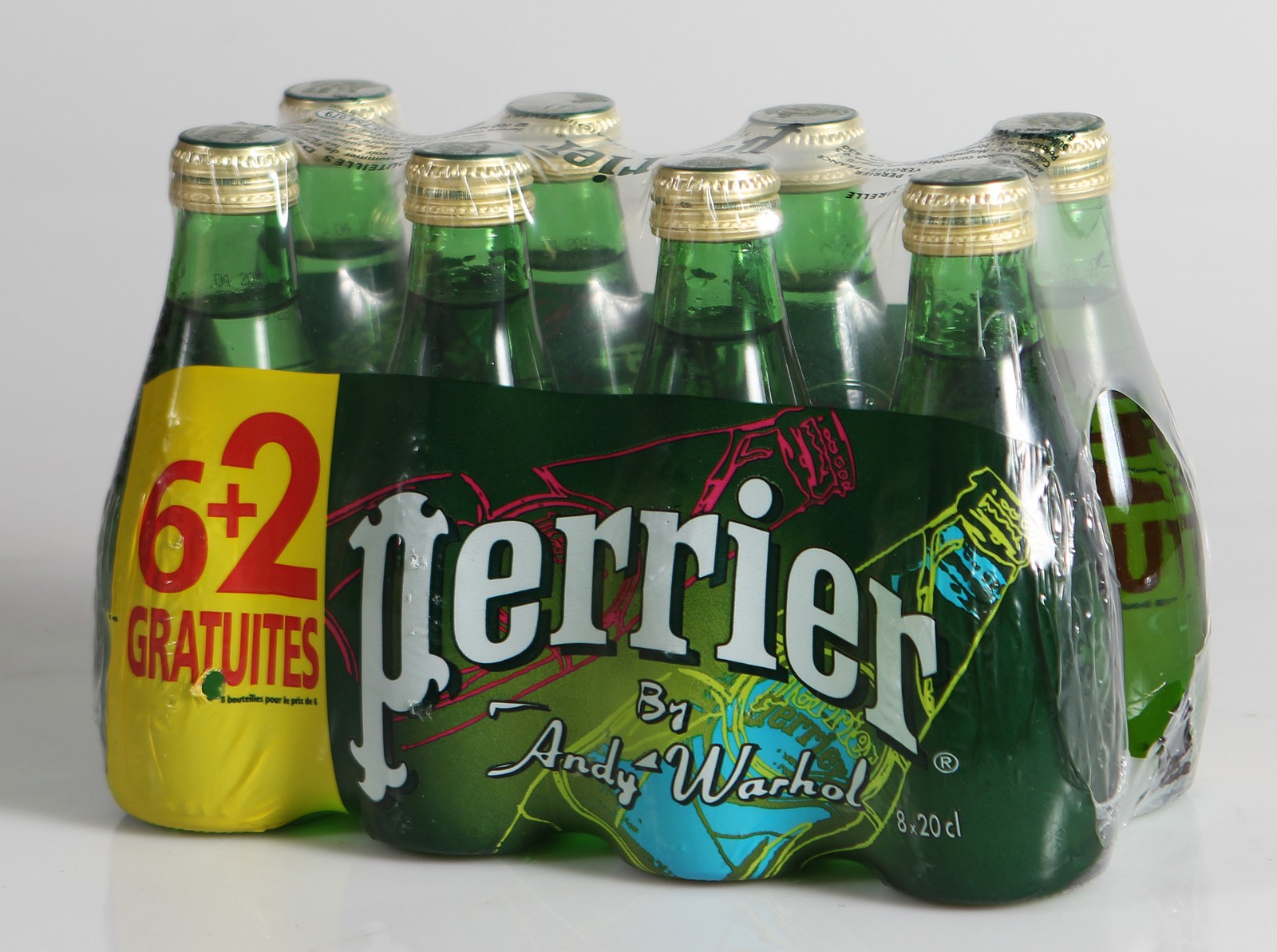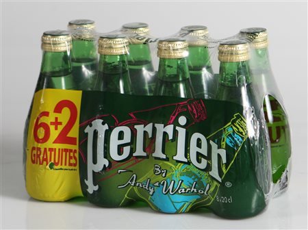 WARHOL ANDY (1928 - 1987) Perrier by Andy Warhol. 200 cc. Plastica. Cm 24,00 x 15,00 x 12,00. Confezione da n. 6 bottiglie di acqua minerale naturale Perrier con etichetta d'autore in occasione dei 150 anni di attività dell'azienda.