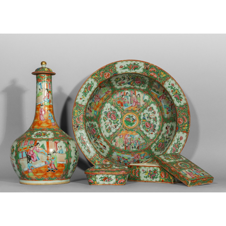 Vaso a bottiglia coppa e due scatole in porcellana Canton decorati in policromia Cina inizi sec.XX