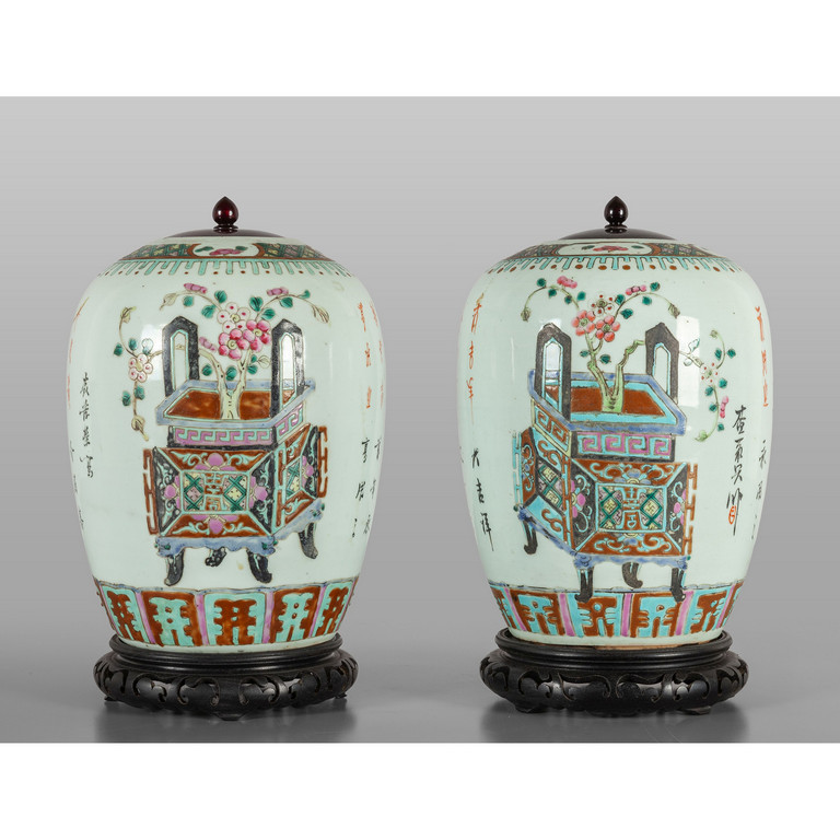 Coppia di vasi in porcellana decorati in policromia con vasi di fiori basi in legno Cina fine sec.XIX