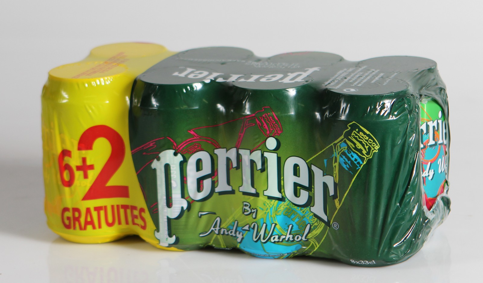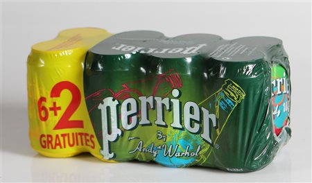 WARHOL ANDY (1928 - 1987) Perrier by Andy Warhol. 33 cc lattine. Latta. Cm 26,00 x 12,00 x 10,00. Confezione da n. 8 lattine di acqua minerale naturale Perrier con etichetta d'autore in occasione dei 150 anni di attività dell'azienda.
