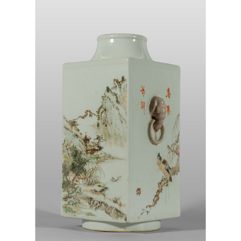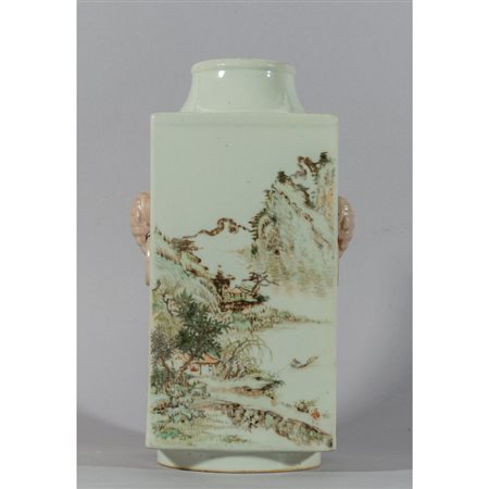 Vaso in porcellana di forma quadrata decorato in policromia con paesaggio e volatili Cina inizi sec.XX