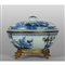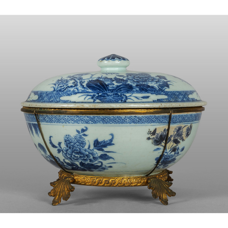 Zuppiera in porcellana decorazione bianca e blu a fiori base in metallo dorato Cina sec.XIX