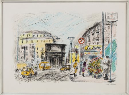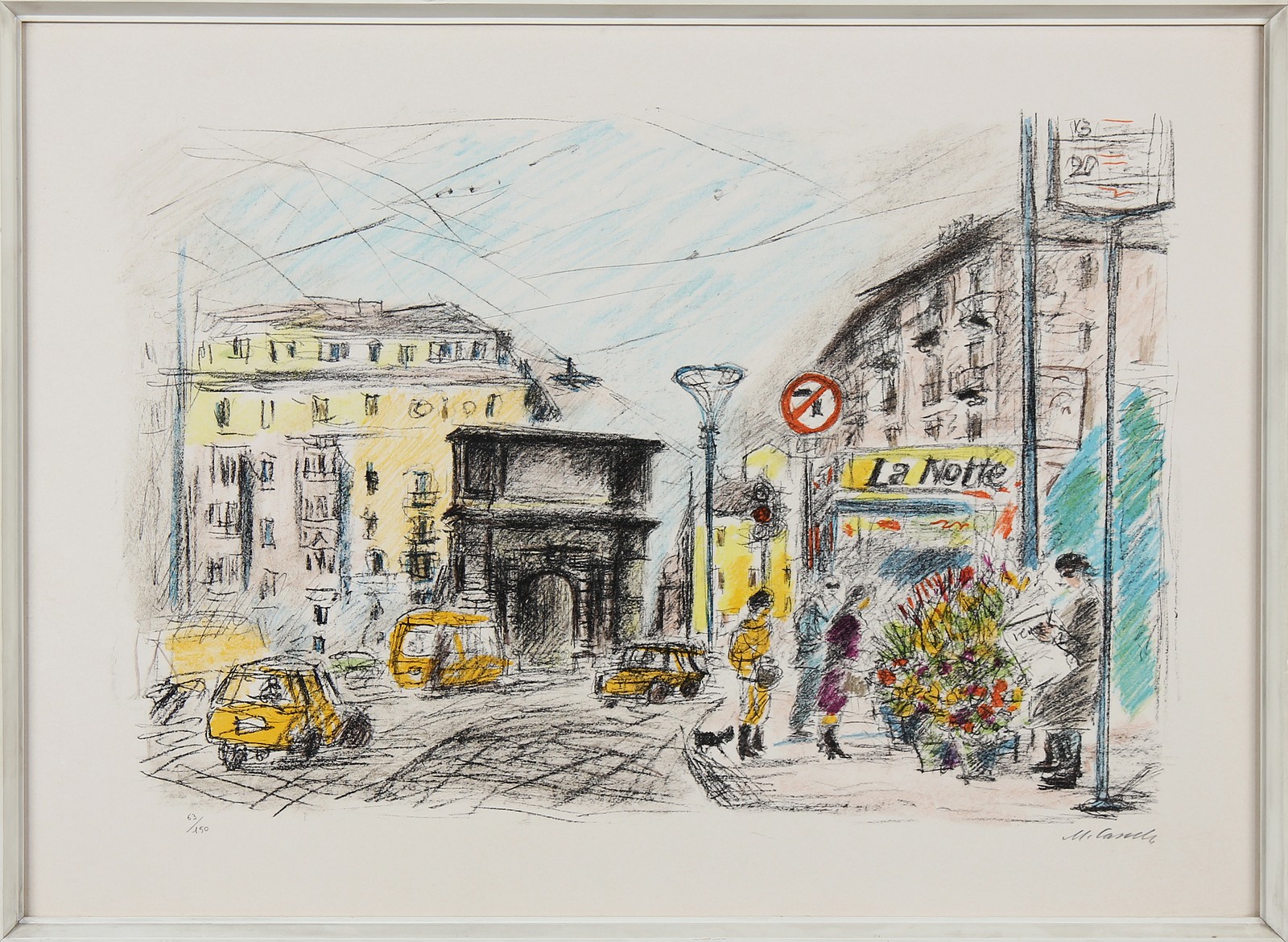 CASCELLA MICHELE (1892 - 1989) Porta Romana. Litografia. Cm 70,00 x 50,00. 63/150. Tiratura a matita in basso a sinistra. Firma a matita in basso a destra. Al retro certificato di garanzia di Arti Grafiche Ricordi, Milano. Cornice presente