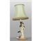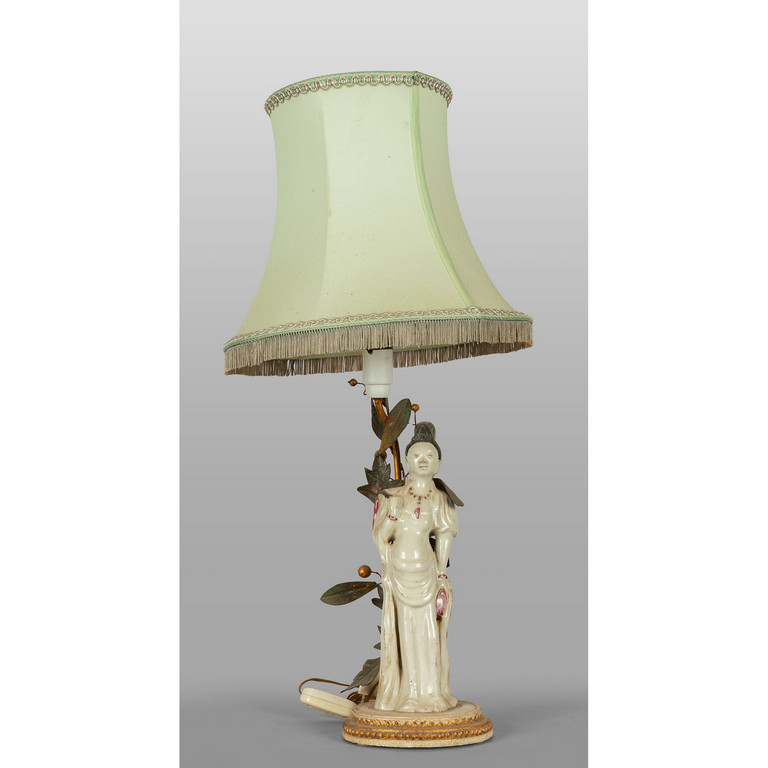 Abat-jour con figura cinese in gres policromo montata su base in legno laccato e dorato con stelo in ferro dorato decorato con foglia in latta policroma