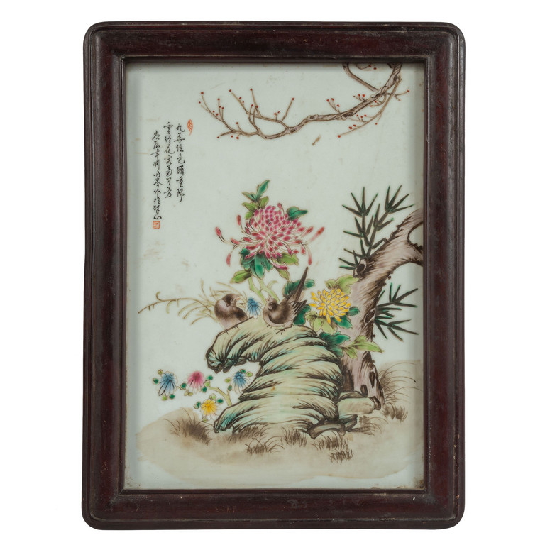 Placca in porcellana decorata in policromia cornice in legno Cina sec.XIX