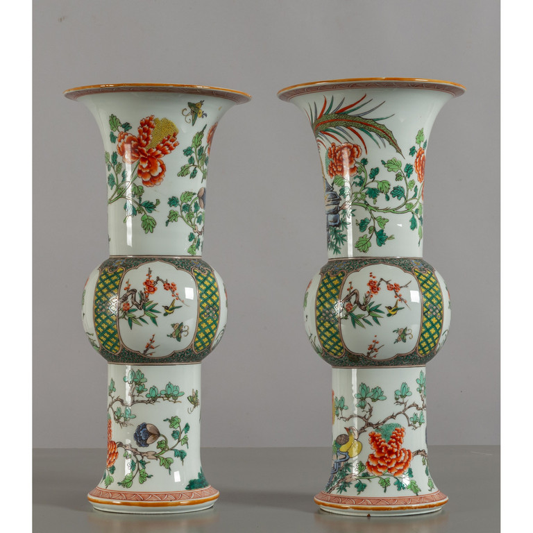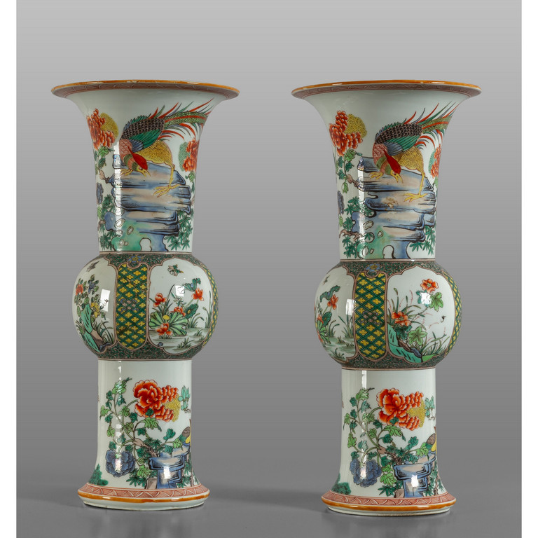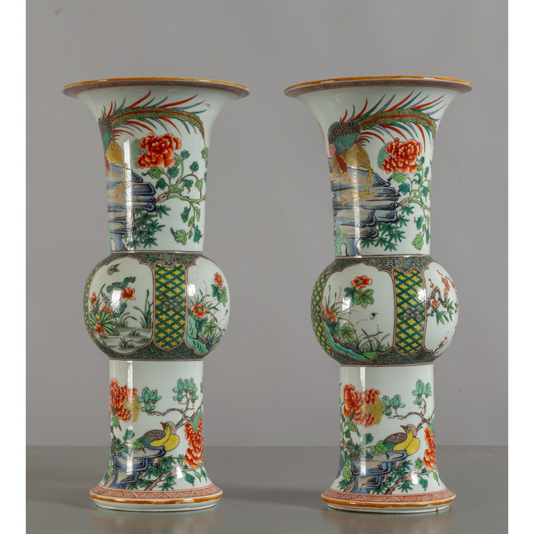 Coppia di vasi a tromba in porcellana policroma famiglia Verde Sanson fine sec.XIX