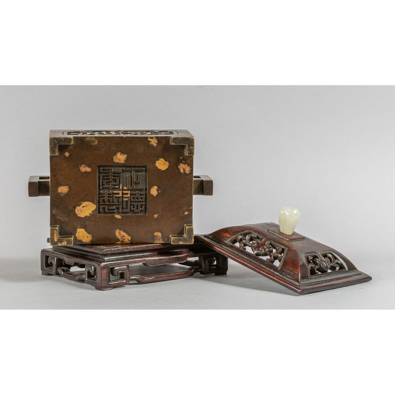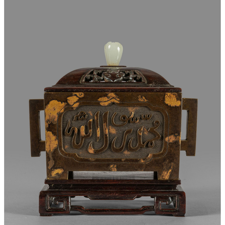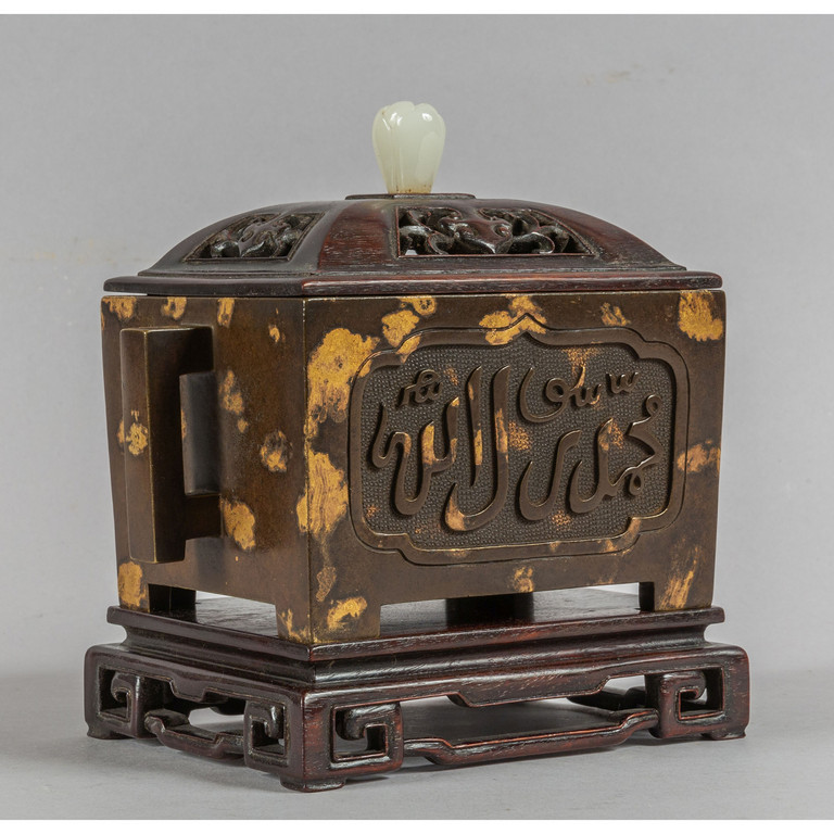 Bruciaprofumo in bronzo con iscrizioni arabe coperchio in legno con presa in giada
