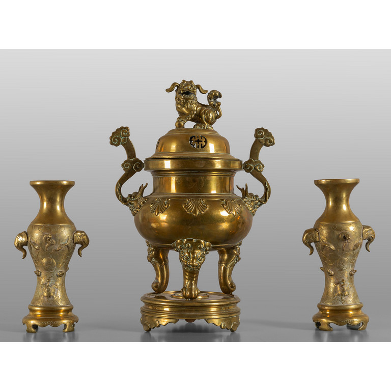 Trittico in bronzo formato da due vasi e un bruciaprofumo Cina inizi sec.XX