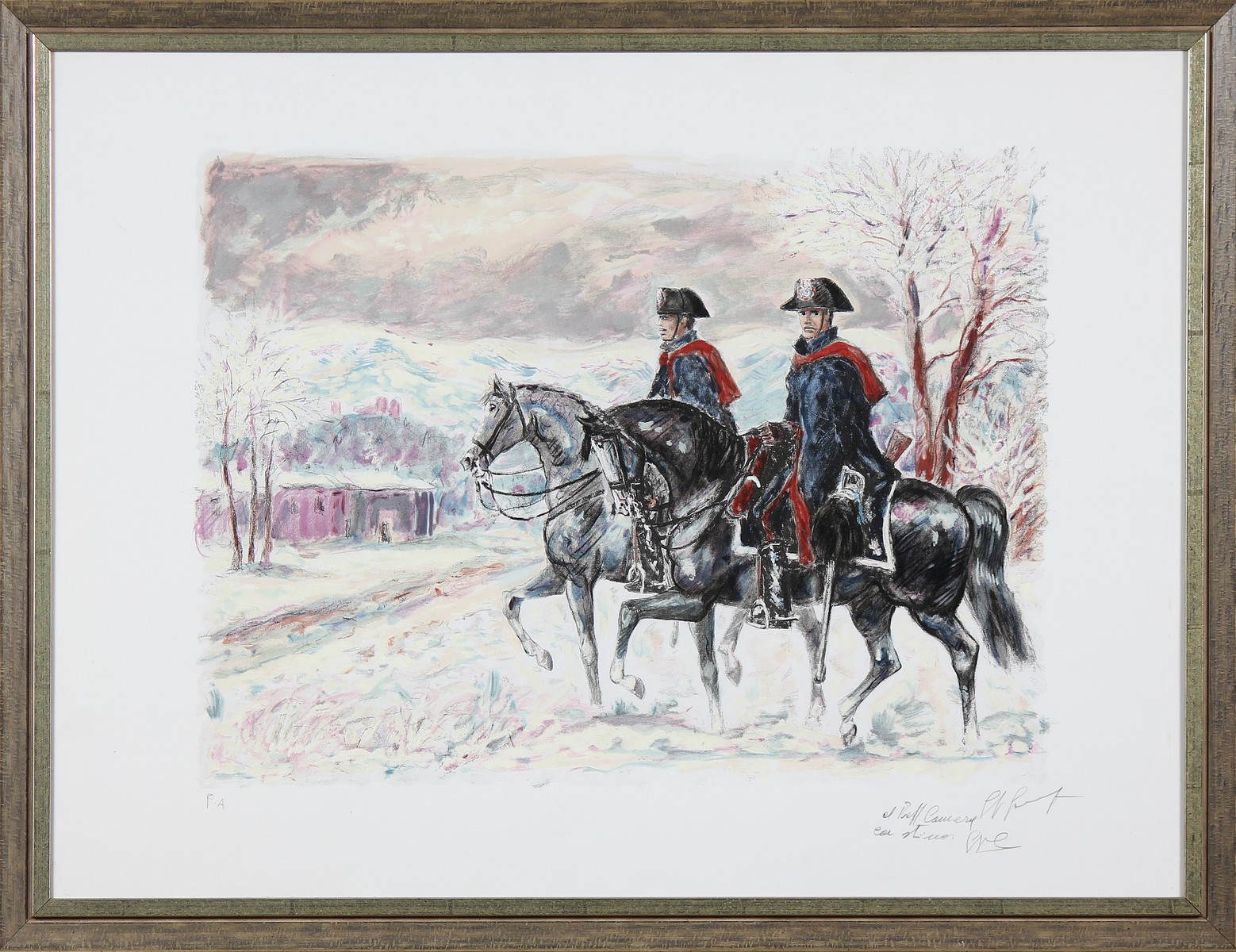 GONZAGA GIOVAN FRANCESCO (1921 - 2007) Carabinieri a cavallo. Litografia. Cm 79,00 x 59,00. Prova d'autore a matita in basso a sinistra. Firma e dedica a matita in basso a destra. Cornice presente