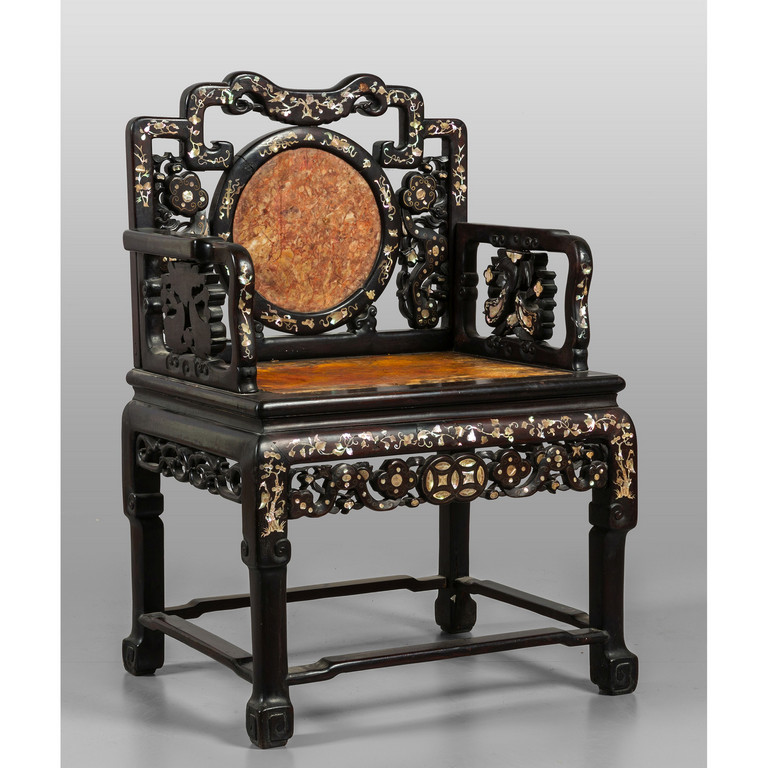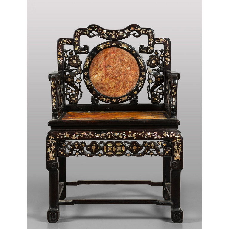 Poltrona in legno intagliato ed ebanizzato con inserti in marmo Cina sec.XIX