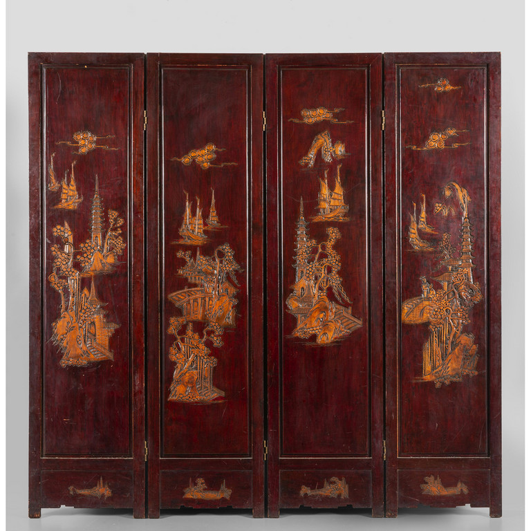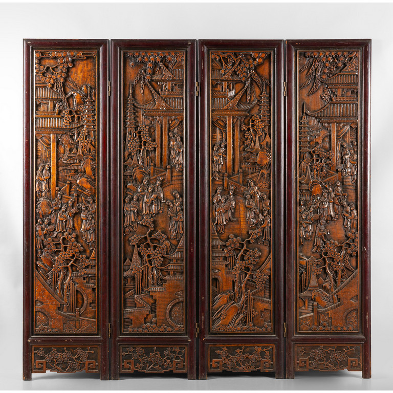 Paravento a quattro ante in teak intagliato da entrambi i lati con scene di vita cinese fine sec.XIX