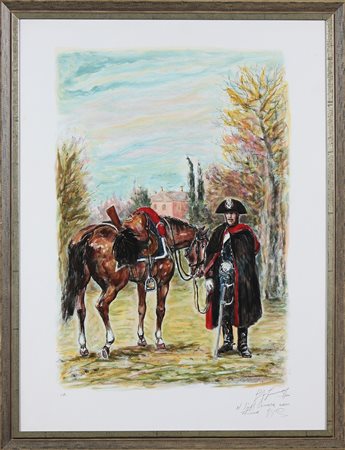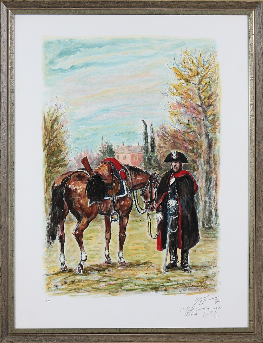 GONZAGA GIOVAN FRANCESCO (1921 - 2007) Carabiniere a cavallo. Litografia. Cm 59,00 x 79,00. Prova d'autore a matita in basso a sinistra. Firma e dedica a matita in basso a destra. Cornice presente