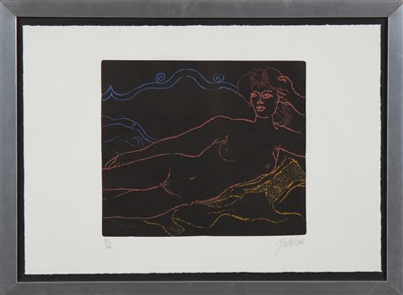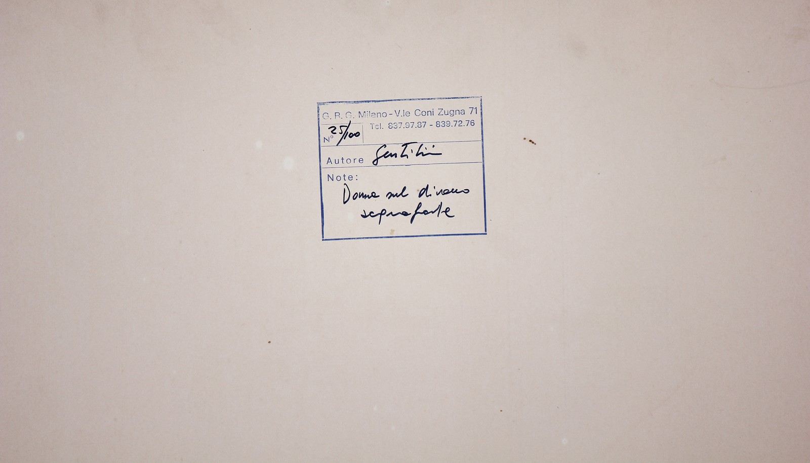 GENTILINI ALDO (1911 - 1982) Donna sul divano. Litografia. Cm 49,00 x 36,00. 25/100. Tiratura a matita in basso a sinistra. Firma a matita in basso a destra. Lieve ondulazione della carta. Timbro a stampa su retro G.R.G.Milano. Cornice presente