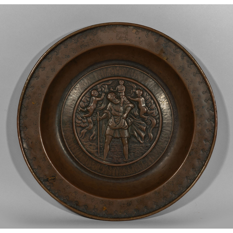 Grande piatto elemosiniere in bronzo sbalzato con San Cristoforo ed Il Bambino sec.XVI