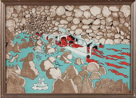 HENRY MAURICE (1907 - 1984) Nero 1679. 1980. Litografia. Cm 70,00 x 48,00. 7/100. Firma in basso a destra a matita e tiratura in basso a sinistra a matita. Al retro certificato di garanzia a cura della casa editrice La Nuova Foglio srl timbrato con punzone a secco e firma dell'artista. Cornice presente