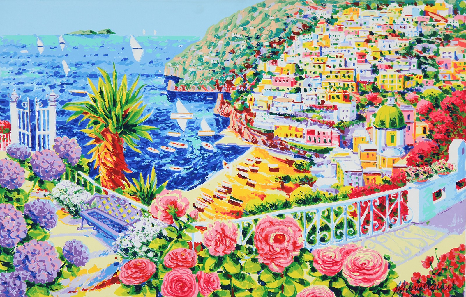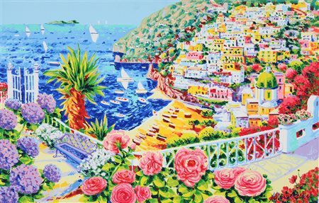 FACCINCANI ATHOS (n. 1951) Momento di dolcezza intorno a Positano. Serigrafia polimaterica su tela. Cm 54,00 x 84,00. LI/CL. Firma in basso a destra. Al retro cartiglio descrittivo e firma di Athos Faccincani.