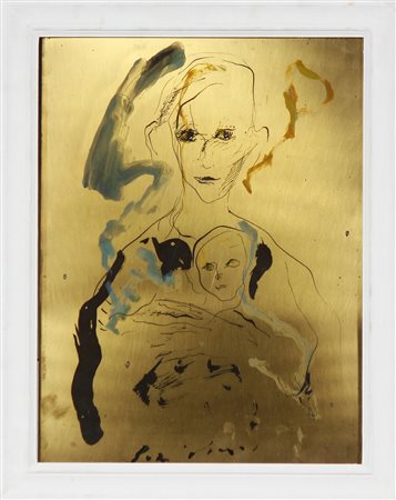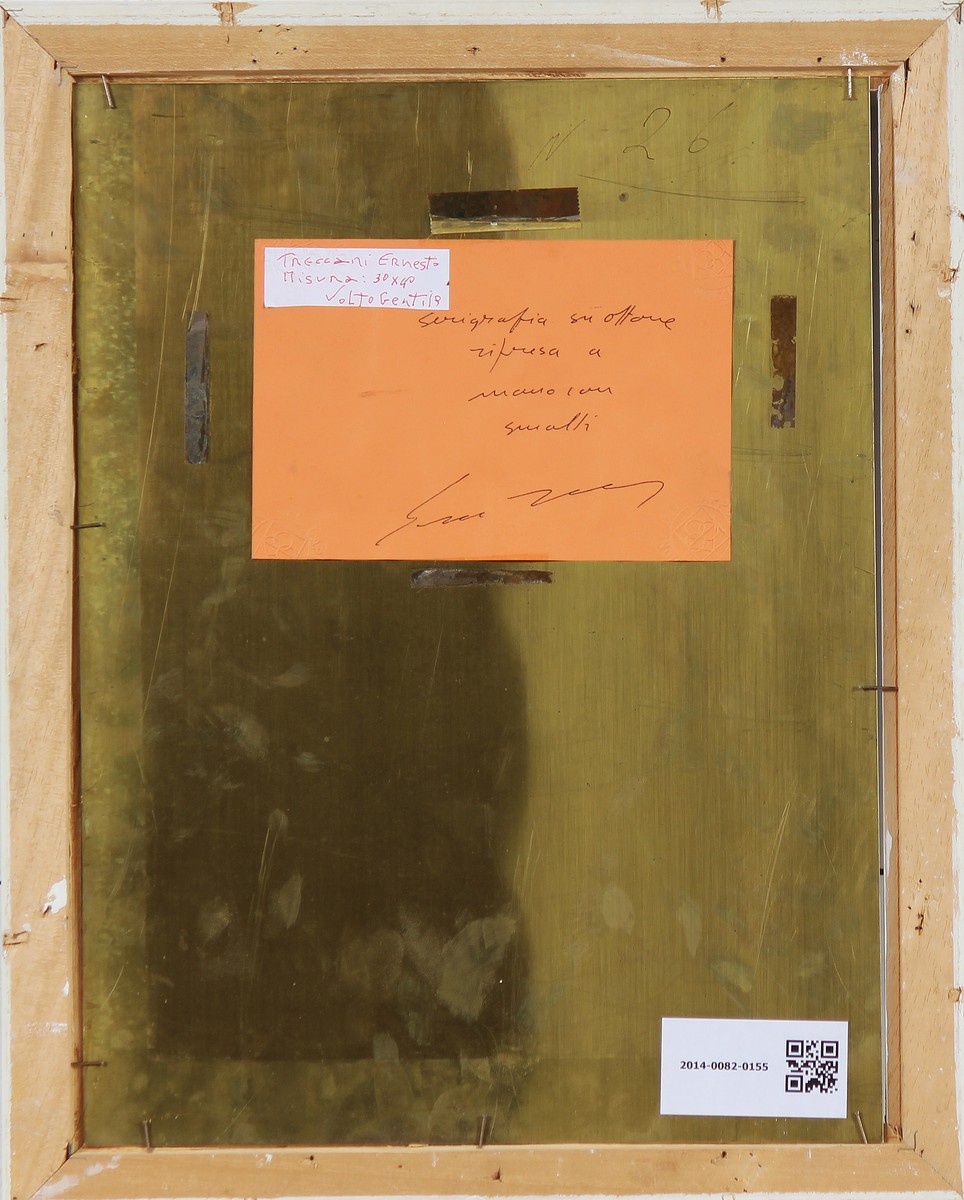 TRECCANI ERNESTO (1920 - 2009) Volto gentile. Serigrafia su ottone rispresa a mano con smalti. Cm 30,00 x 40,00. Multiplo. Al retro cartiglio descrittivo con firma per autentica con timbro a secco. Inciso sul retro della tavola il numero 26. Cornice presente