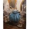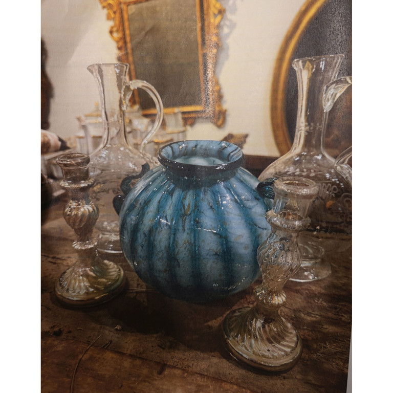 Due piccoli candelieri in vetro due bottigliette in vetro ed un vaso blu (rotture)