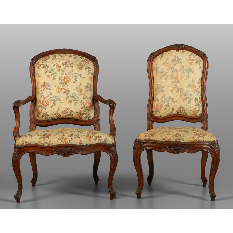 Una poltrona ed una sedia Luigi XV in noce intagliato con roselline Genova sec.XVIII