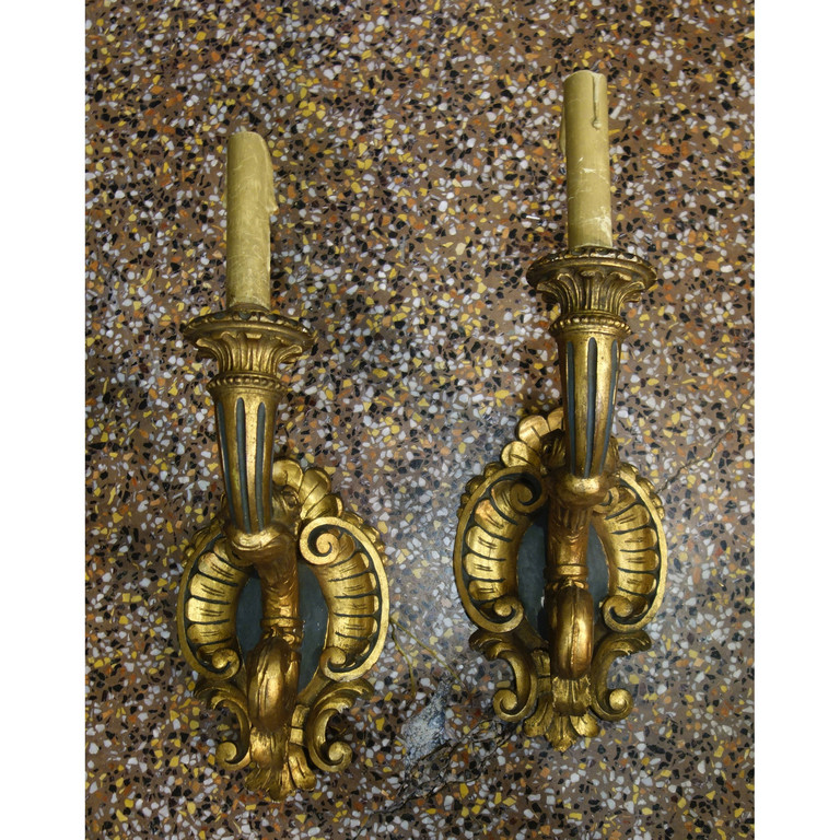 Coppia di bracci portaluce in legno intagliato laccato e dorato sec.XX