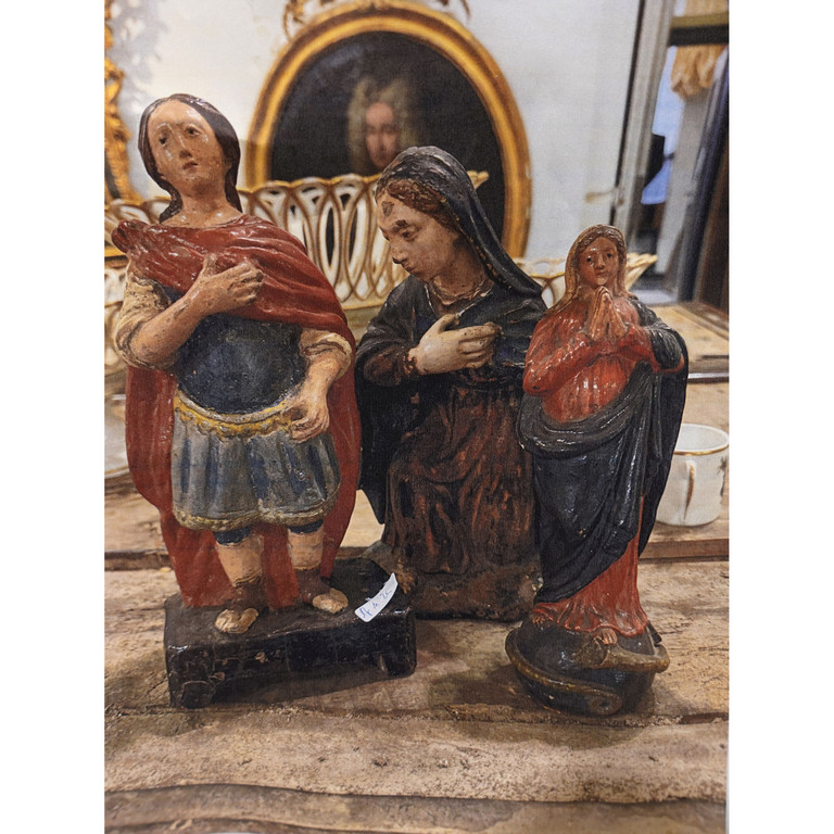 Tre sculture raffiguranti due Madonnine ed un Santo in terracotta dorata