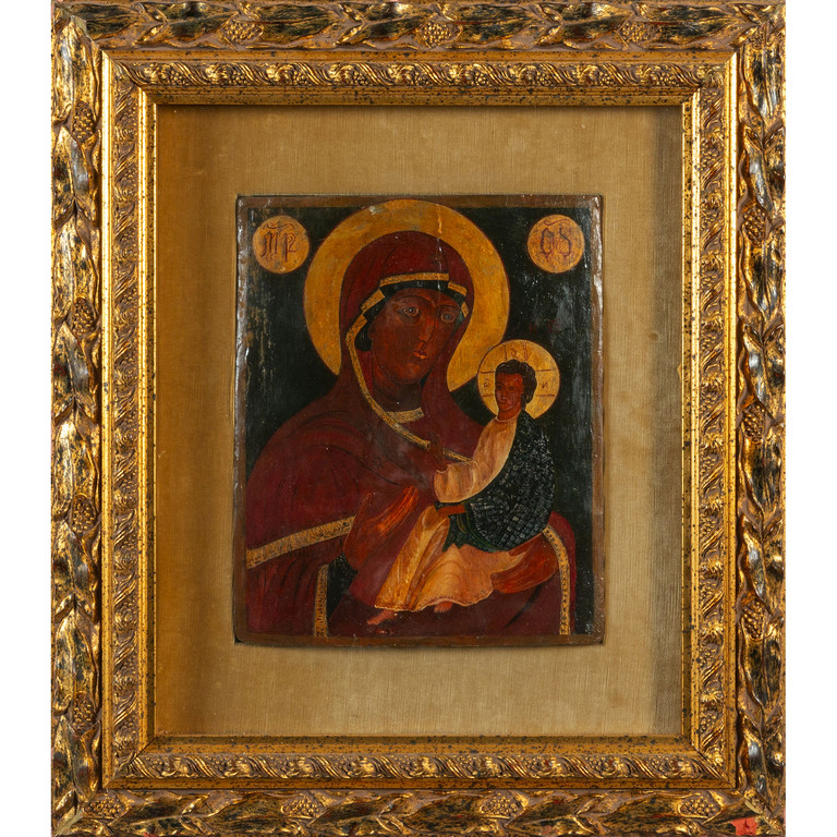 Antica icona raffigurante Madonna con Bambino olio cornice moderna
