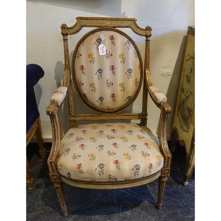 Coppia di poltrone Luigi XVI schienale a medaglione in legno laccato e dorato Francia II metà sec.XVIII