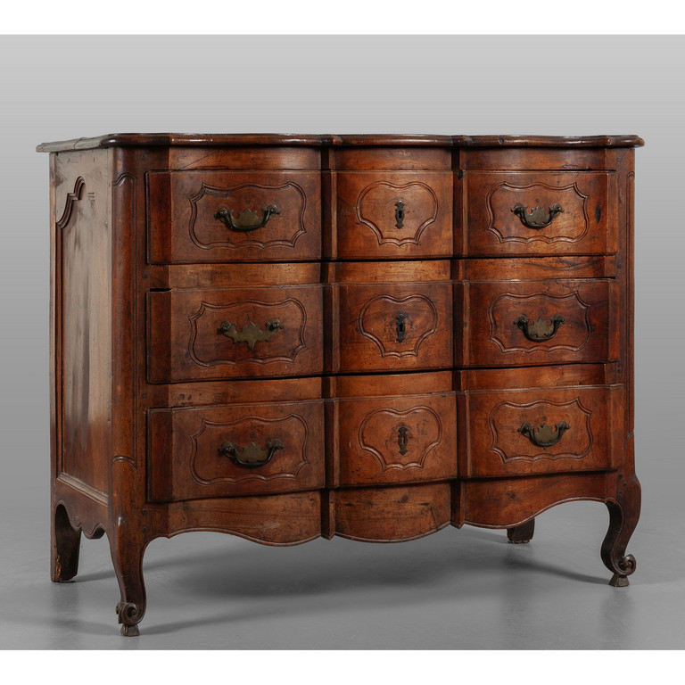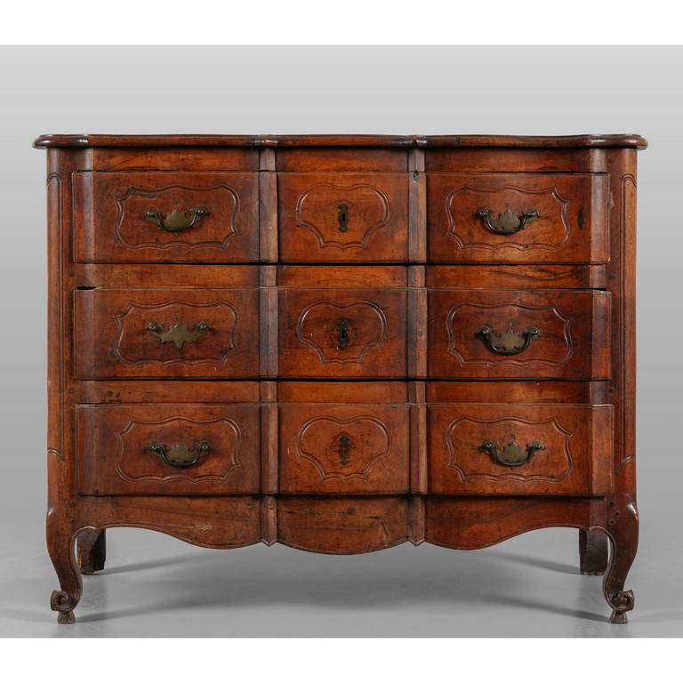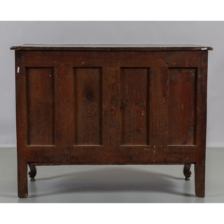 Comò Luigi XIV in massello di noce tre cassetti movimentato sul fronte con formelle intagliate Provenza I metà sec.XVIII