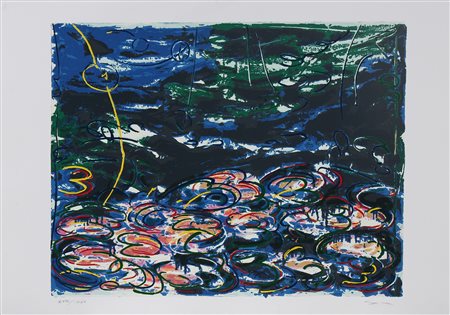 SCHIFANO MARIO (1934 - 1998) Gigli d'acqua. Litografia. Cm 70,00 x 70,00. XVIII/XXV. Tiratura a matita in basso a sinistra, firma a matita in basso a destra e timbro a secco Mastrogiacomo Editore d'acqua.