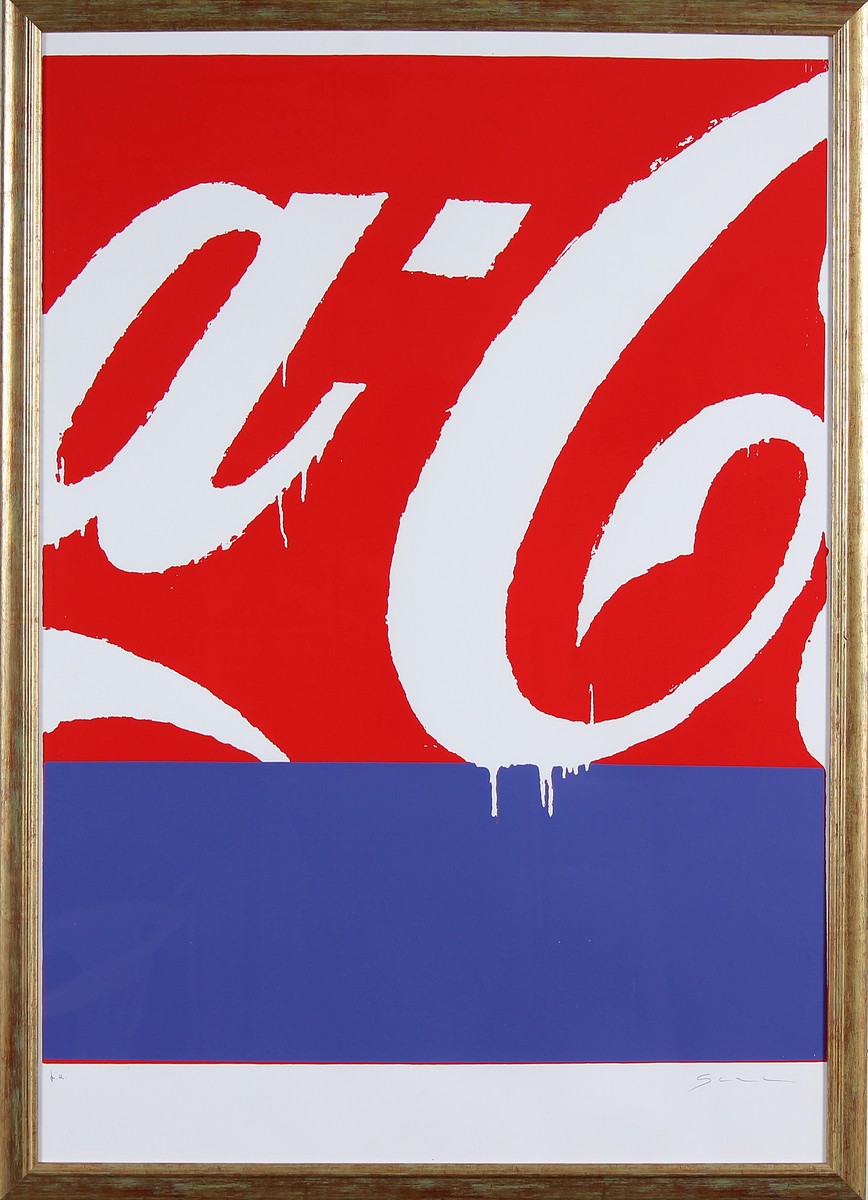 SCHIFANO MARIO (1934 - 1998) Coca Cola. Litografia. Cm 70,00 x 100,00. P.d.a a matita in basso a sinistra e firma a matita in basso a destra. Timbro a secco Mastrogiacomo Casa Editrice, Padova. Cornice presente