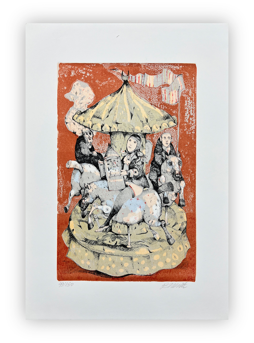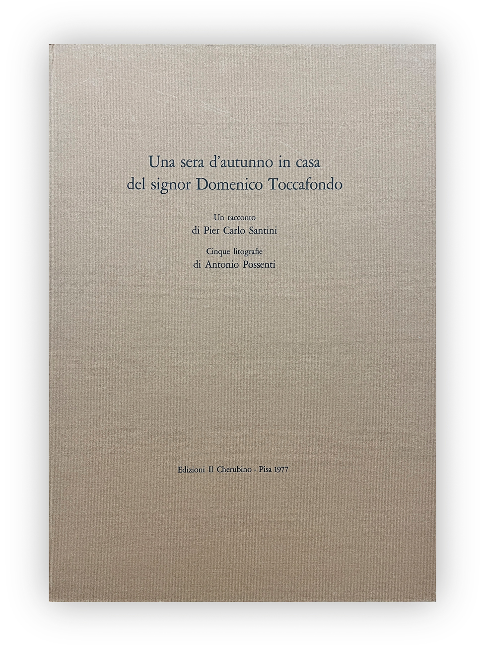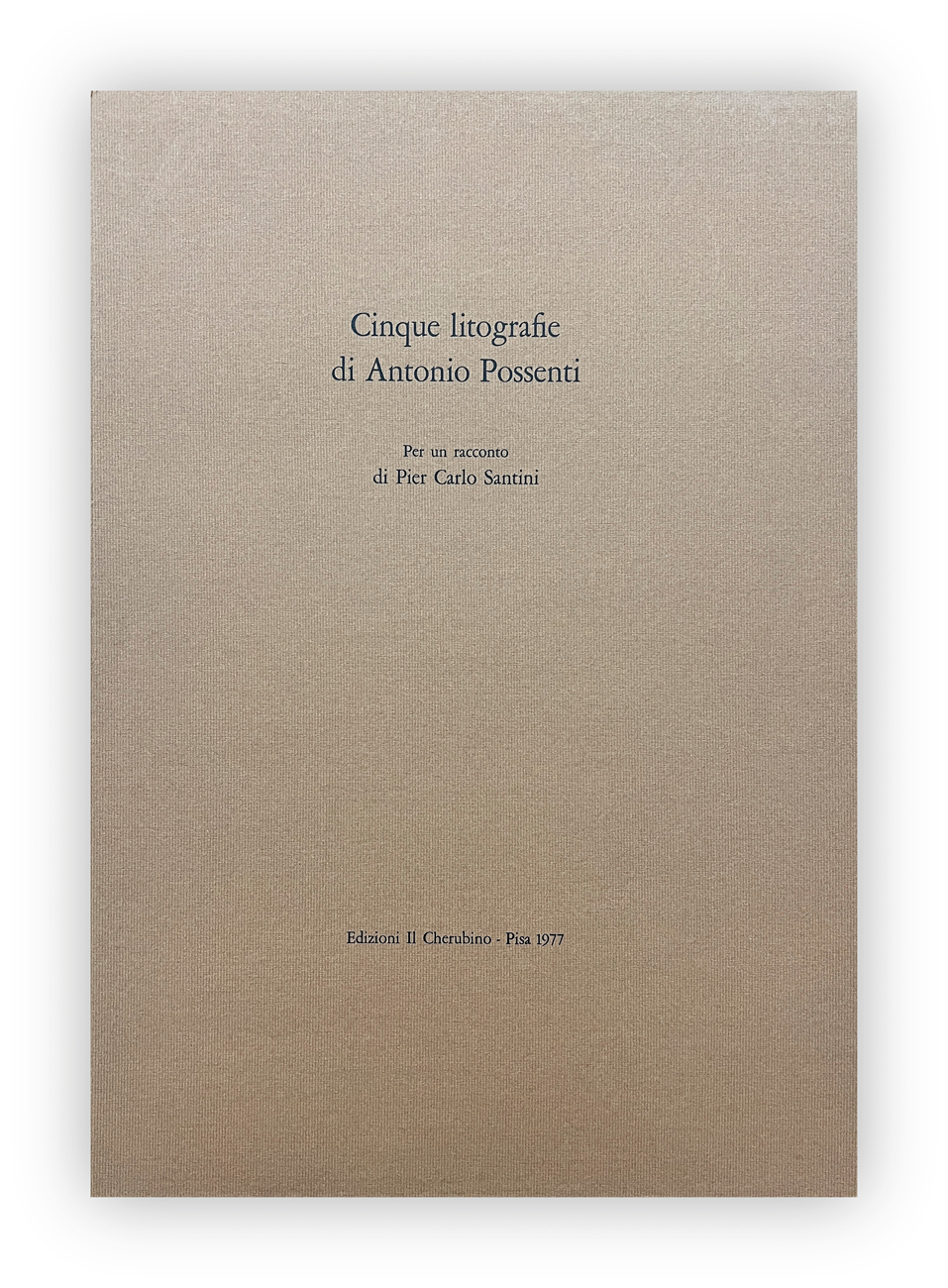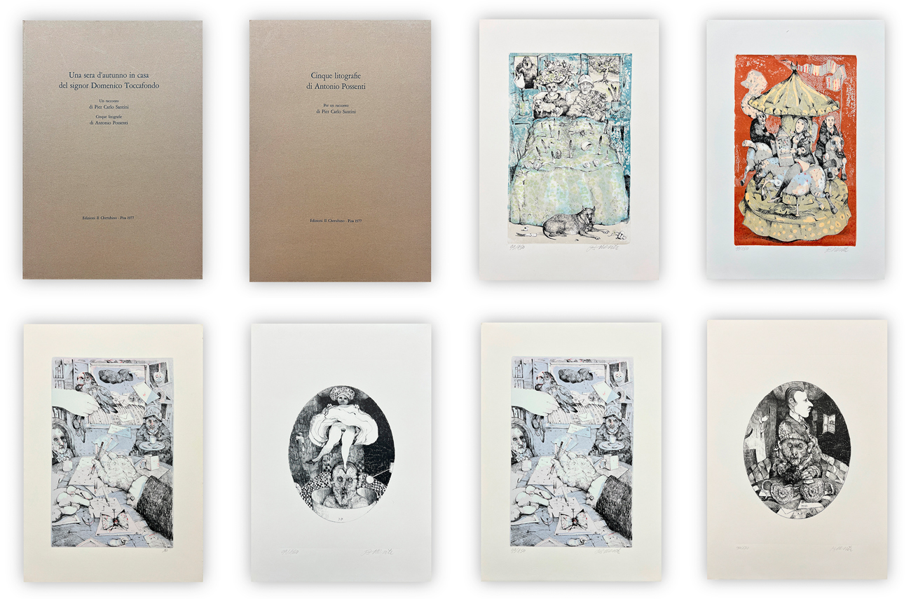 Edizione d'arte composta da due cartelle: una recante un racconto di Pier Carlo Santini e l'altra contenete la suite delle 5 litografie originali di Antonio Possenti, ciascuna recante firma e numerazione (Esemplari 99/150) a matita al fronte