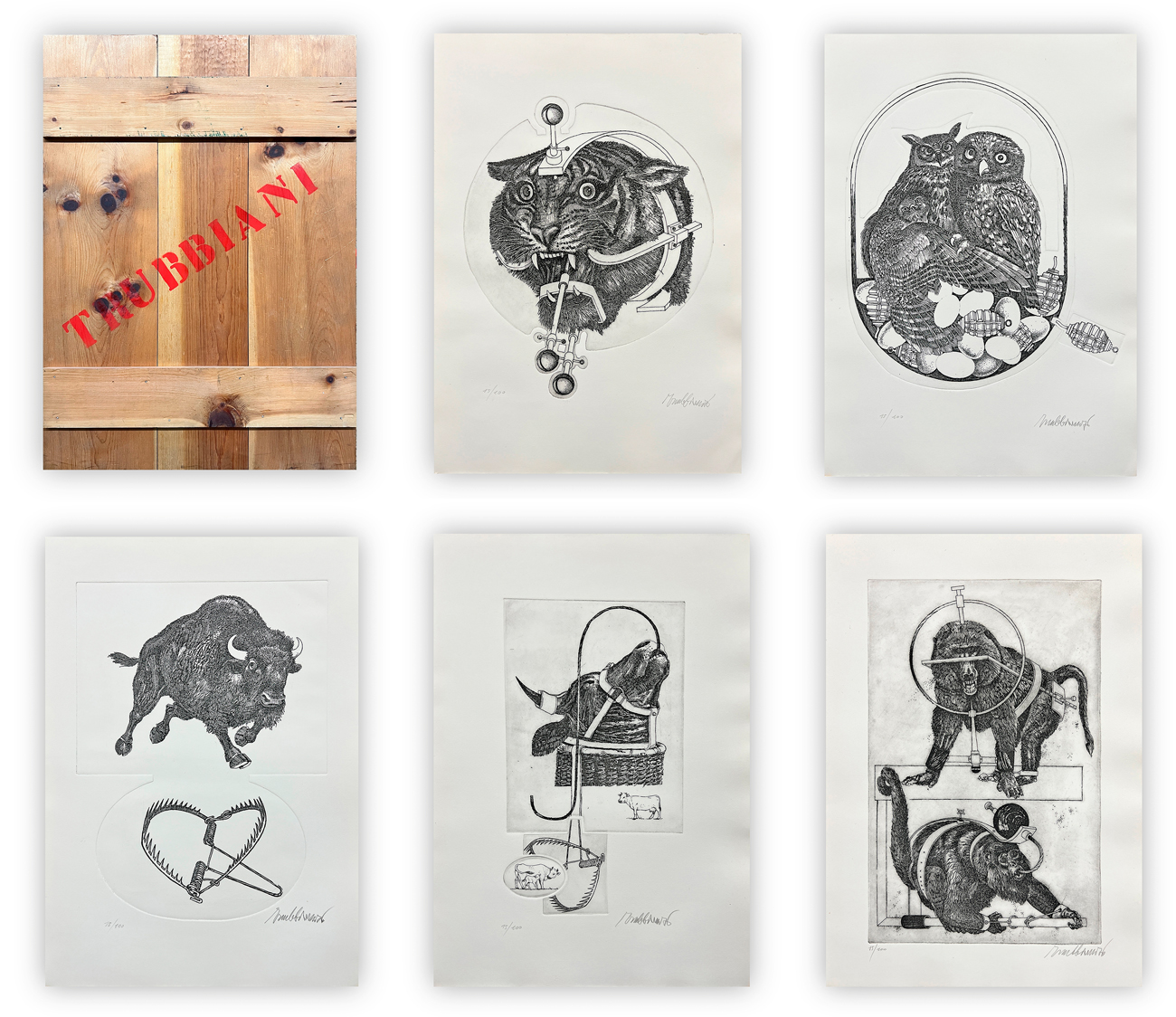 Cartella recante cinque acqueforti di Valeriano Trubbiani, ciascuna recante firma, datazione e numerazione (Esemplari 15/100) a matita al fronte