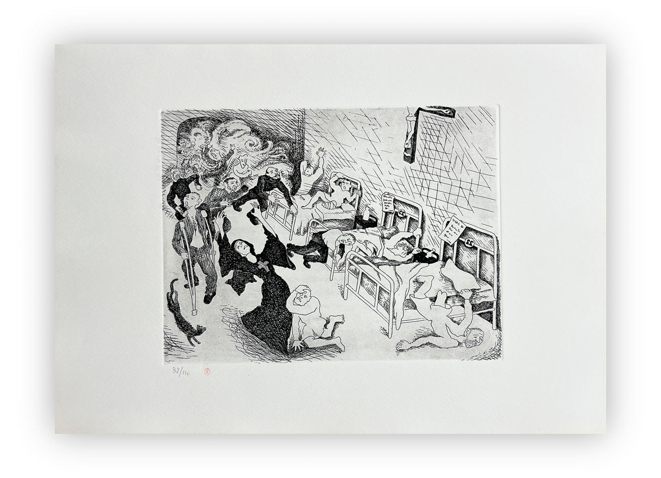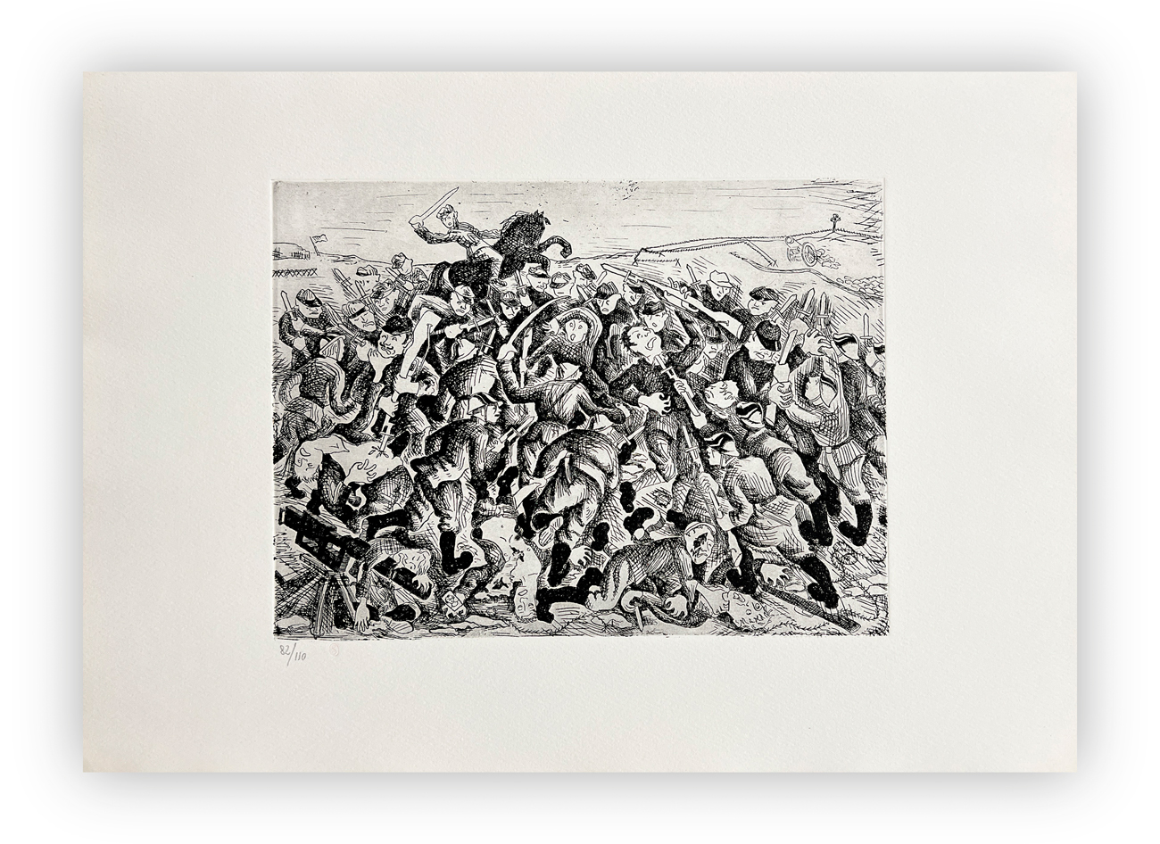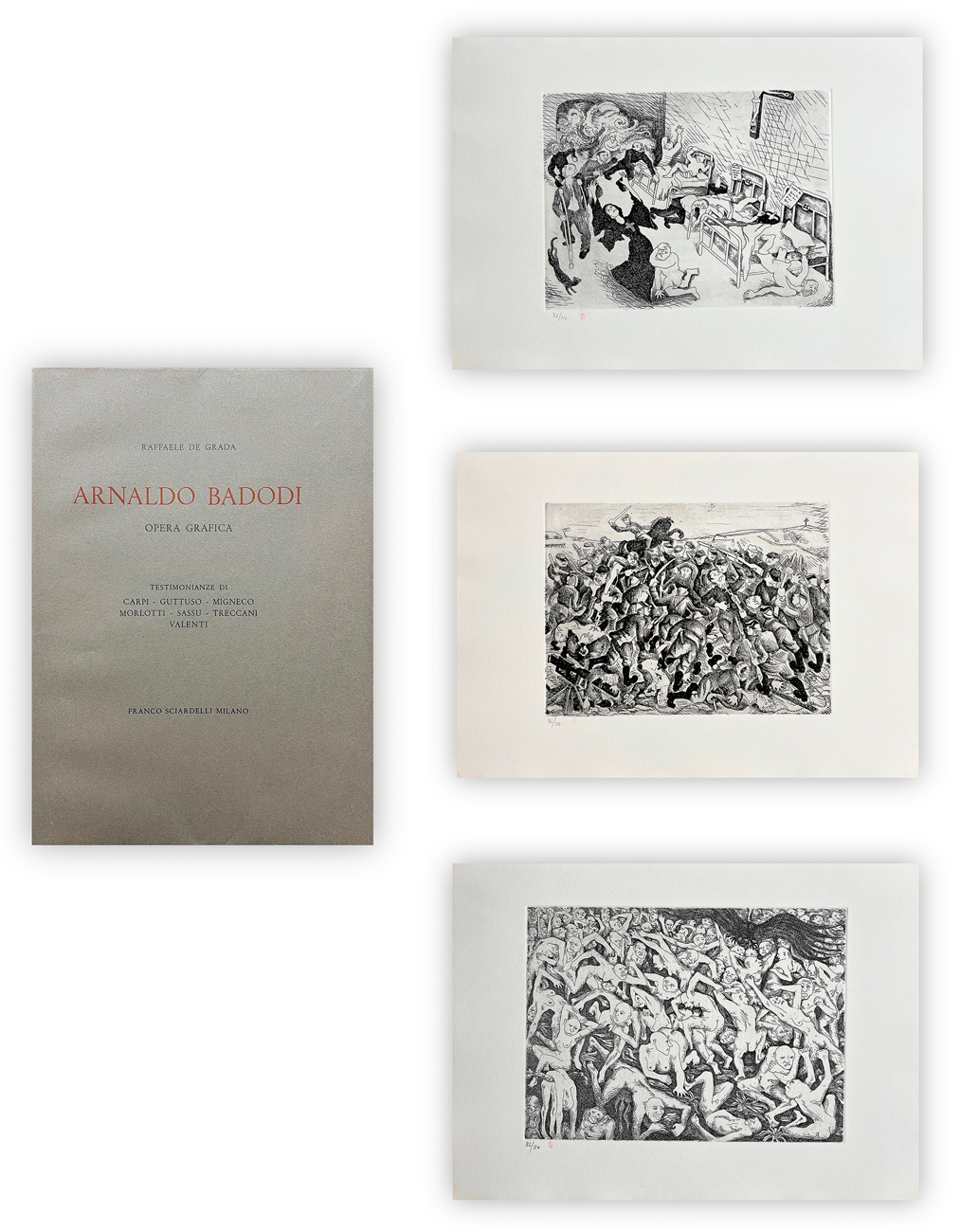 Edizione d'arte, curata da Raffaele De Grada e recante testimonianze di Carpi, Guttuso, Migneco, Morlotti, Sassu, Treccani, Valenti, contenente 3 incisioni all'acquaforte di Arnaldo Badodi, ciascuna recante numerazione (Esemplari 82/110) a matita al fronte