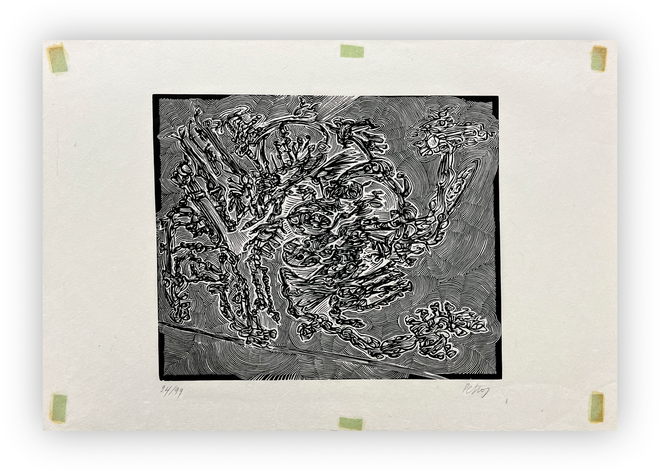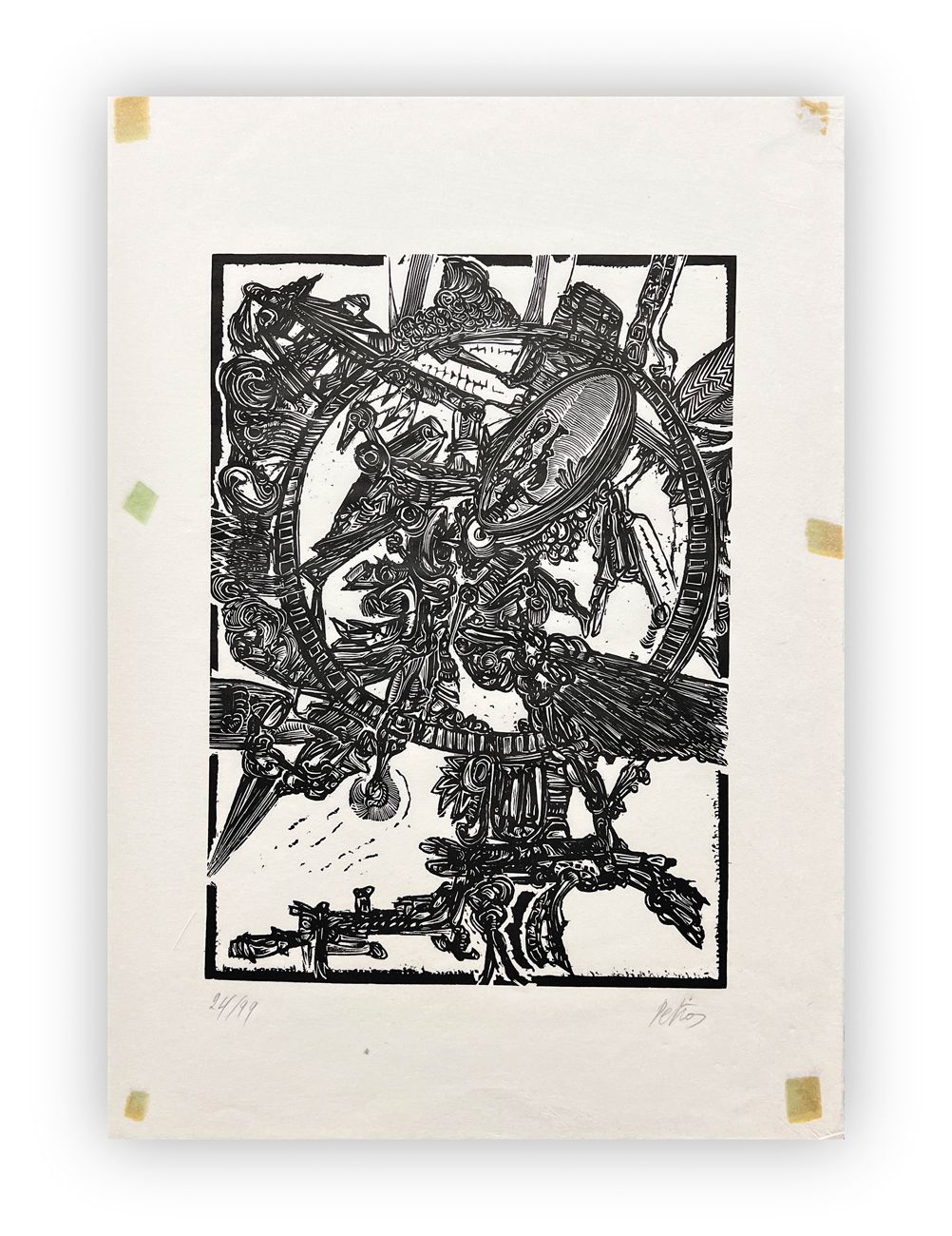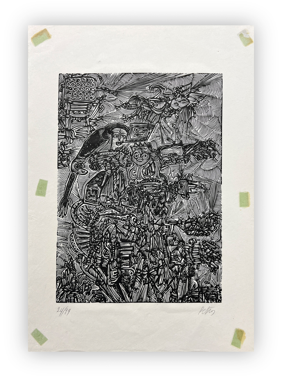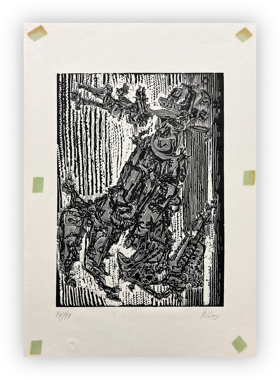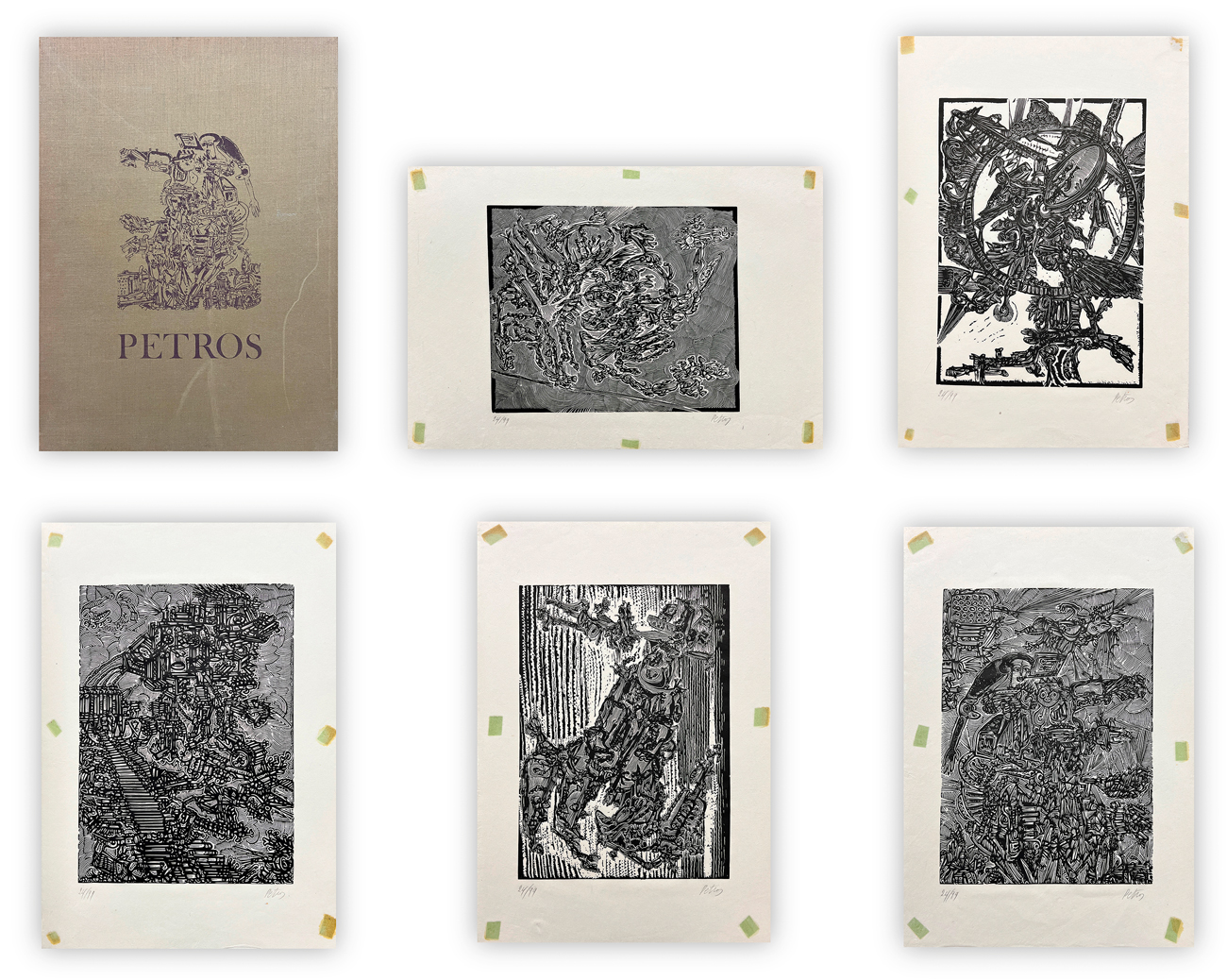 Cartella composta da testo di presentazione di Luigi Cavallo e 15 xilografie originali, eseguite tra il 1970 e il 1972, di Petros, ciascuna recante firma e numerazione (Esemplari 24/99) a matita al fronte