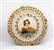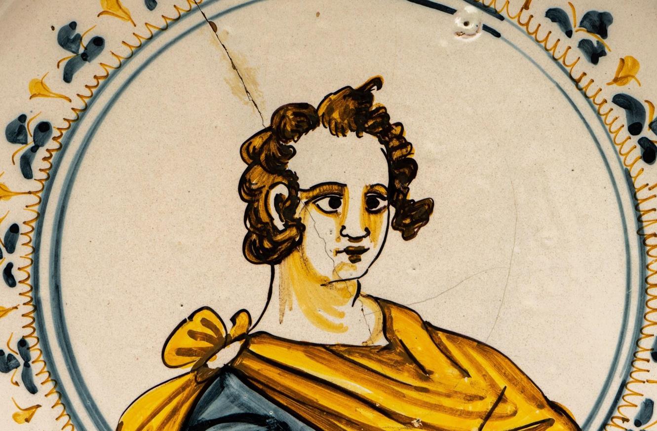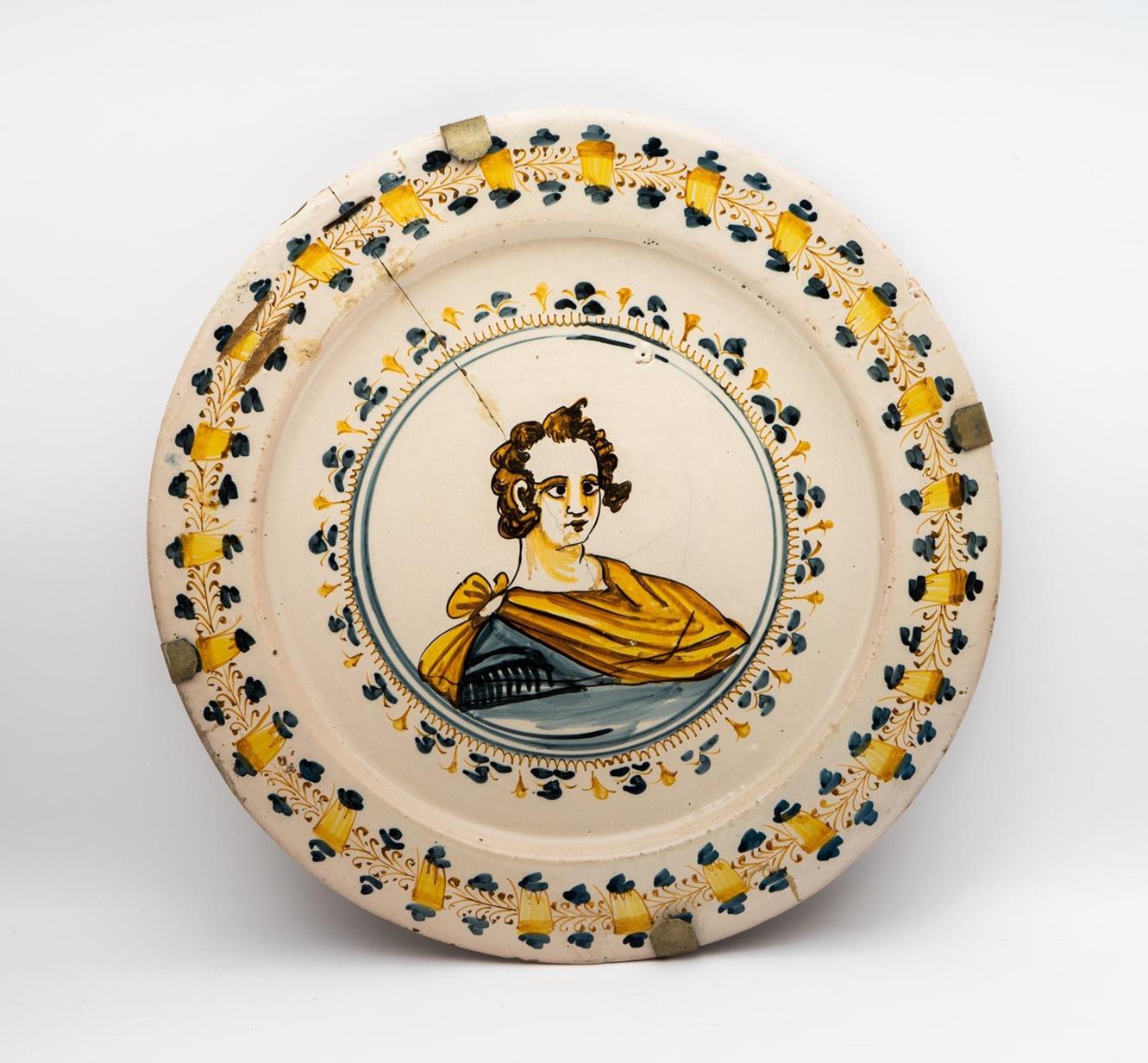 Piatto da parata in maiolica decorata a doppia ghirlanda compendiaria nei toni del blu, giallo e arancio nella tesa e con una riserva centrale nel cavo che incornicia un ritratto virile, simile in tutto ad altri presenti nel soffitto della Chiesa di San Donato a Castelli.